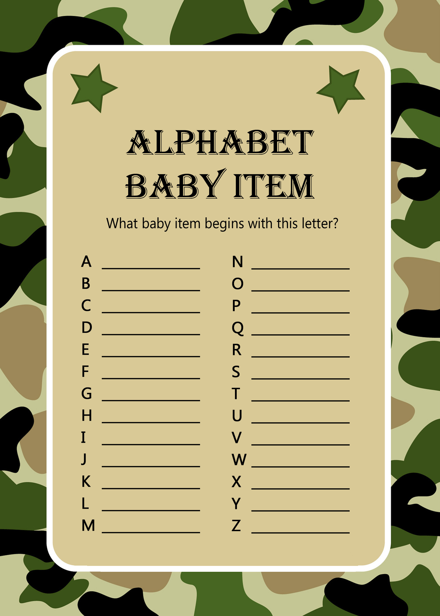 Published at 1500 × 2100 in Camo Baby Shower Game Pack Printable.