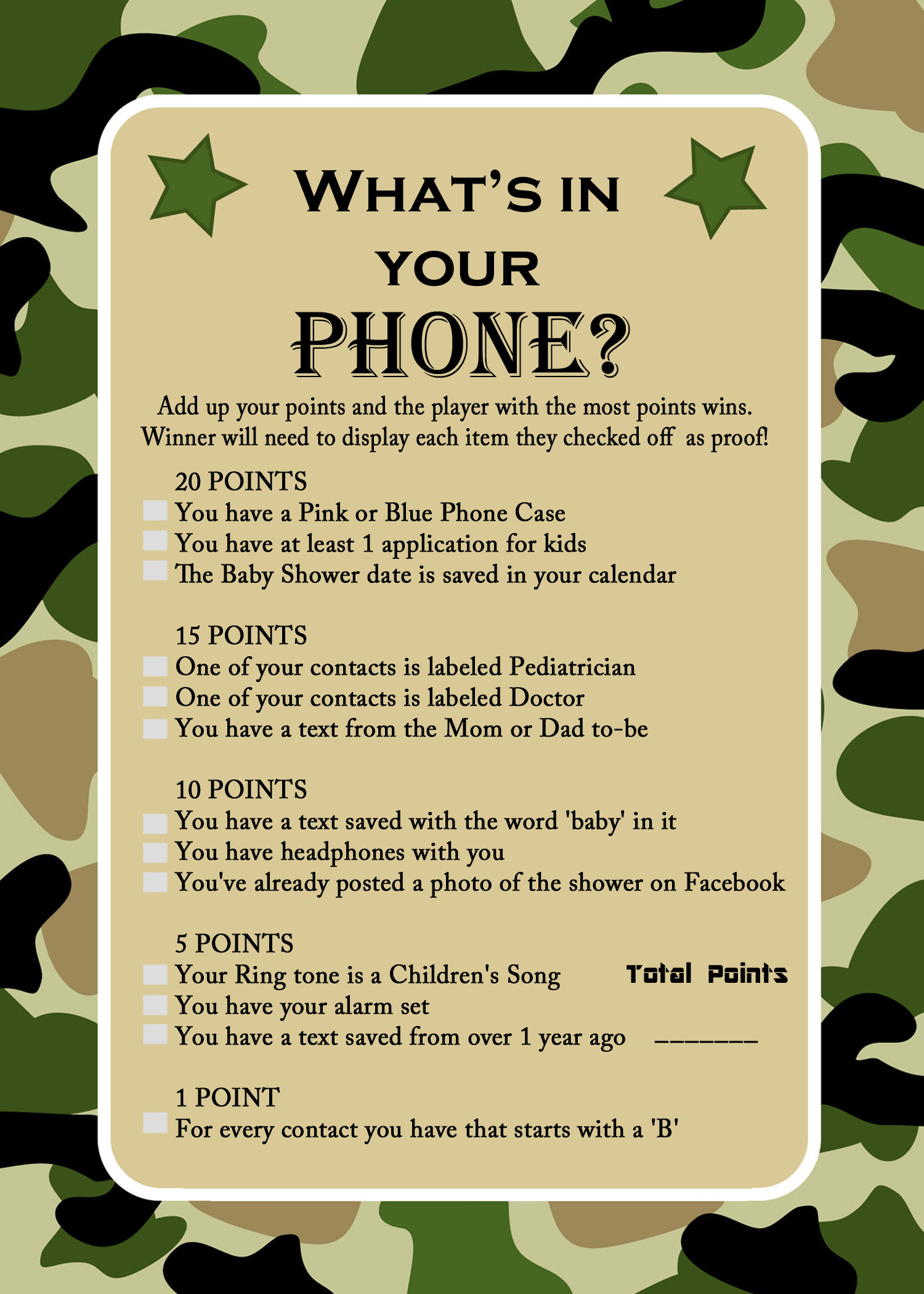 Published at 1500 × 2100 in Camo Baby Shower Game Pack Printable.