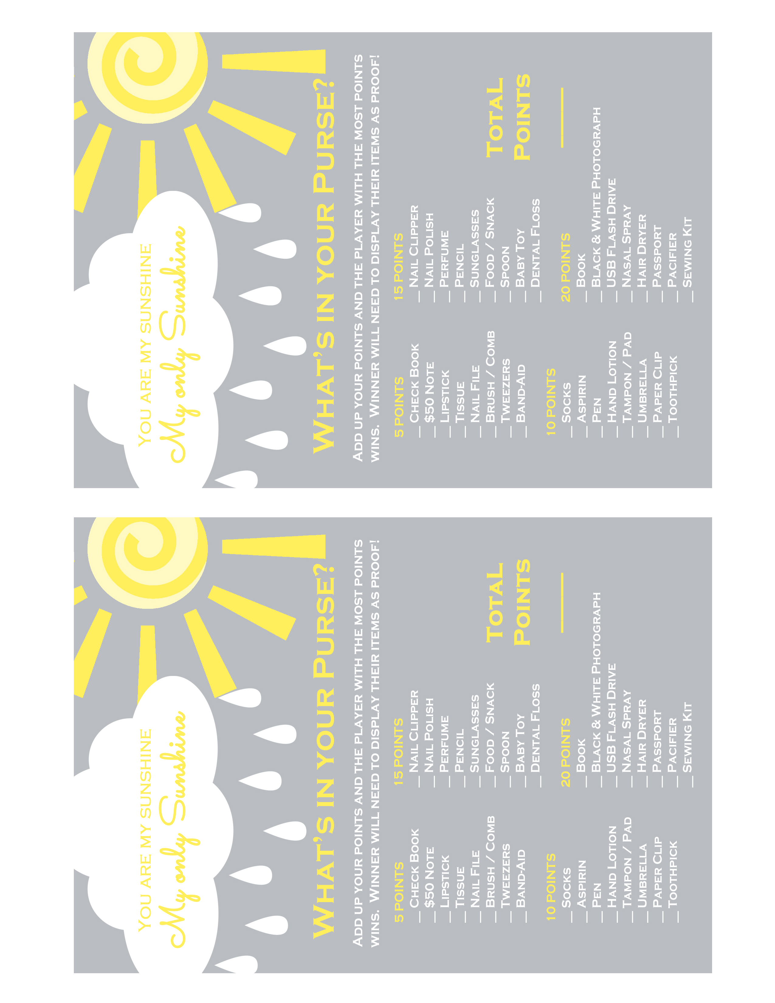 Published at 2550 × 3300 in You are my Sunshine Baby Shower Game Pack.